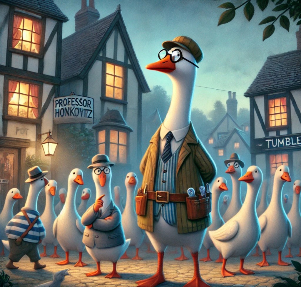Summarised Post: Tumblepot is in turmoil after 27 geese vanished under suspicious circumstances. Evidence points to a possible organized avian operation led by an unusually intelligent goose, Professor Honkowitz. Locals report strange goose behavior, tool belts, and coded honking patterns in the night.