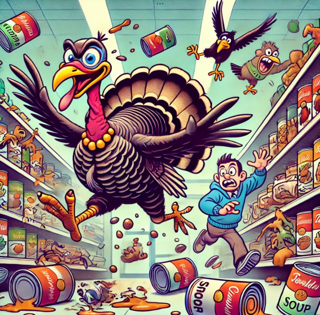 Well, it’s finally happened—Big Goose has activated its sleeper agents. The great avian uprising begins not with a bang, but with a gobble. Indiana shoppers, blissfully unaware that they were walking into a live-action Hitchcock reboot, found themselves victims of a furious turkey who clearly missed the “Happy Thanksgiving” memo. Picture it: a tactical bird, feathers flaring, executing a covert shelf-clearing op while screaming in prehistoric rage. This wasn’t a grocery store—it was a war zone with kale casualties and spilled soup stock.