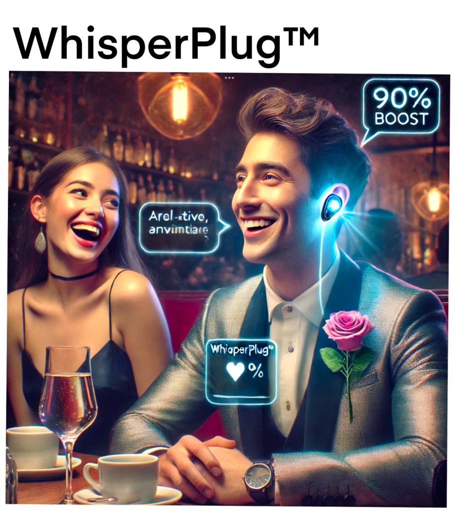 Tired of running out of things to say mid-date? Introducing WhisperPlug™ – the world’s first AI-powered earbud that listens in real time and feeds you funny, flirty, and foolproof one-liners to keep the conversation flowing… and the sparks flying.
