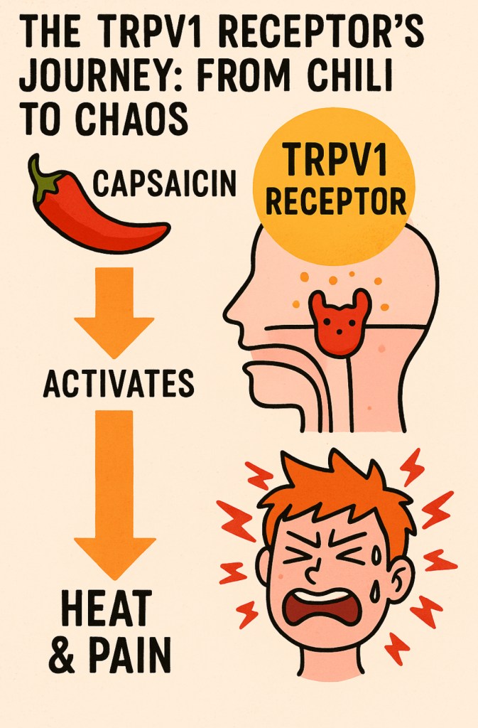 The culprit behind this mouth-based arson is capsaicin, a molecule that activates a receptor in our body called TRPV1 — which, for simplicity, we’ll refer to as the “OH GOD WHY” receptor. This protein exists to detect excessive heat and sound the alarm when things get hot enough to cause damage. Capsaicin, the chemical troll it is, triggers that same alarm even when the food is colder than your ex’s text replies.