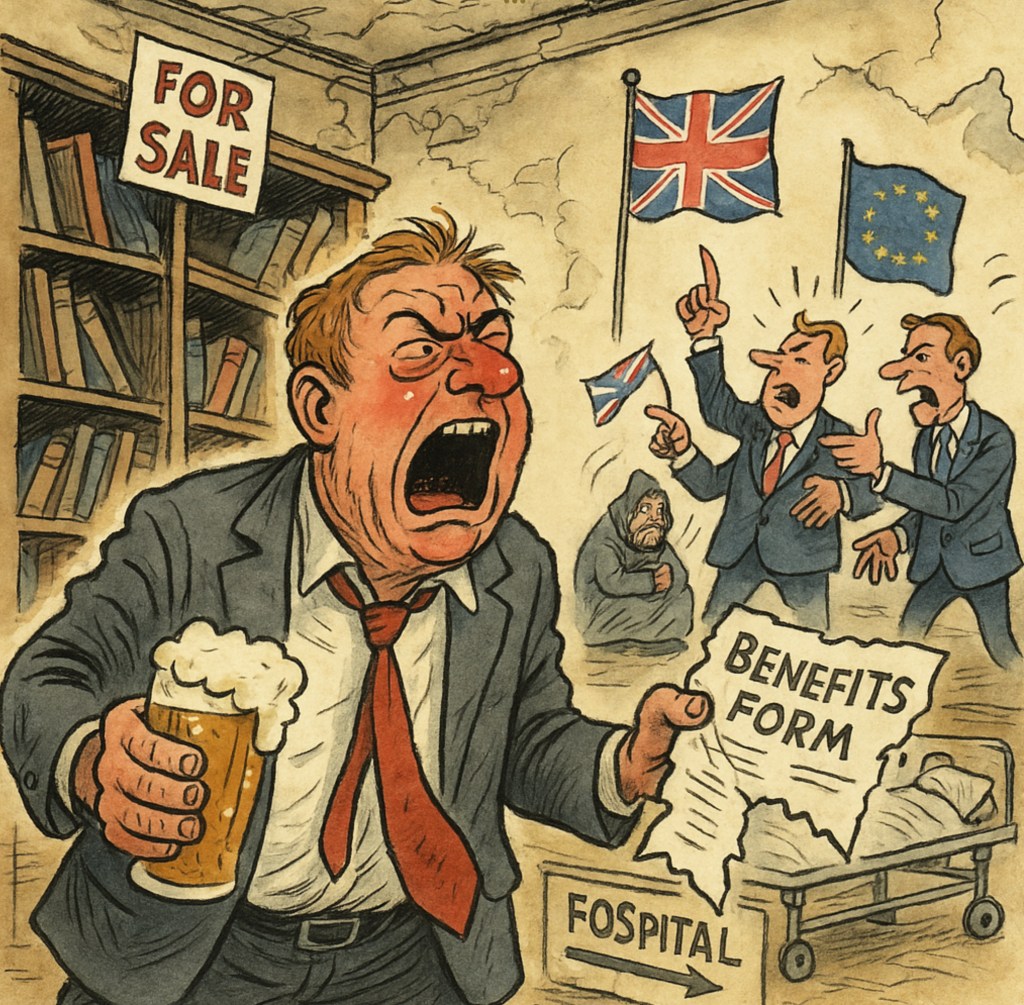 If British politics were a person, it would be a red-faced man in a crumpled tie screaming about sovereignty while holding a pint in one hand and a shredded benefits form in the other. All of this, of course, taking place in the quiet reading room of a crumbling public library about to be sold off to make room for luxury flats.