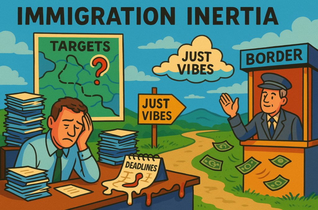 • No immigration targets? That’s like going on a diet without scales, mirrors, or pants. We’re just supposed to “trust the process,” even though the process is currently somewhere between asleep and underwater.