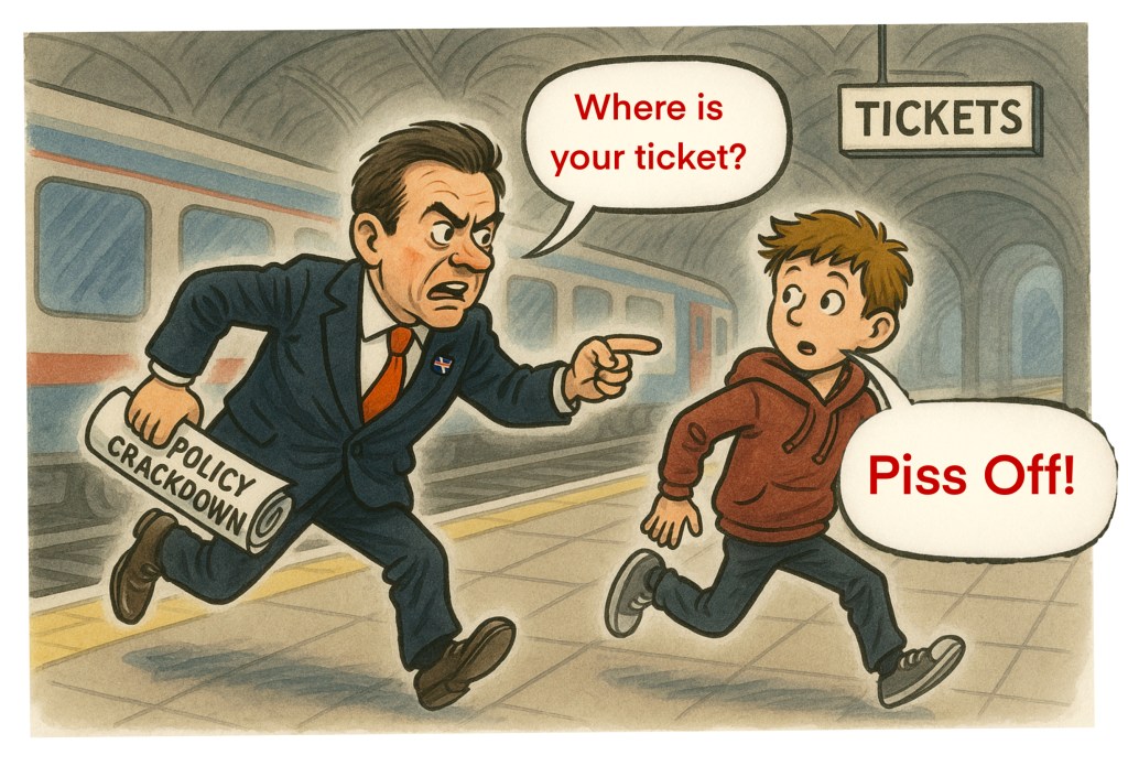There he is — Robert Jenrick, former Minister, now part-time ticket inspector, storming through the concourse of a Midlands train station like a man on a mission. Tie flapping, face set with the righteous fury of a public servant who’s finally found a target he can handle: a young lad with mud on his trainers and not enough in his bank account for peak-time rail fare.