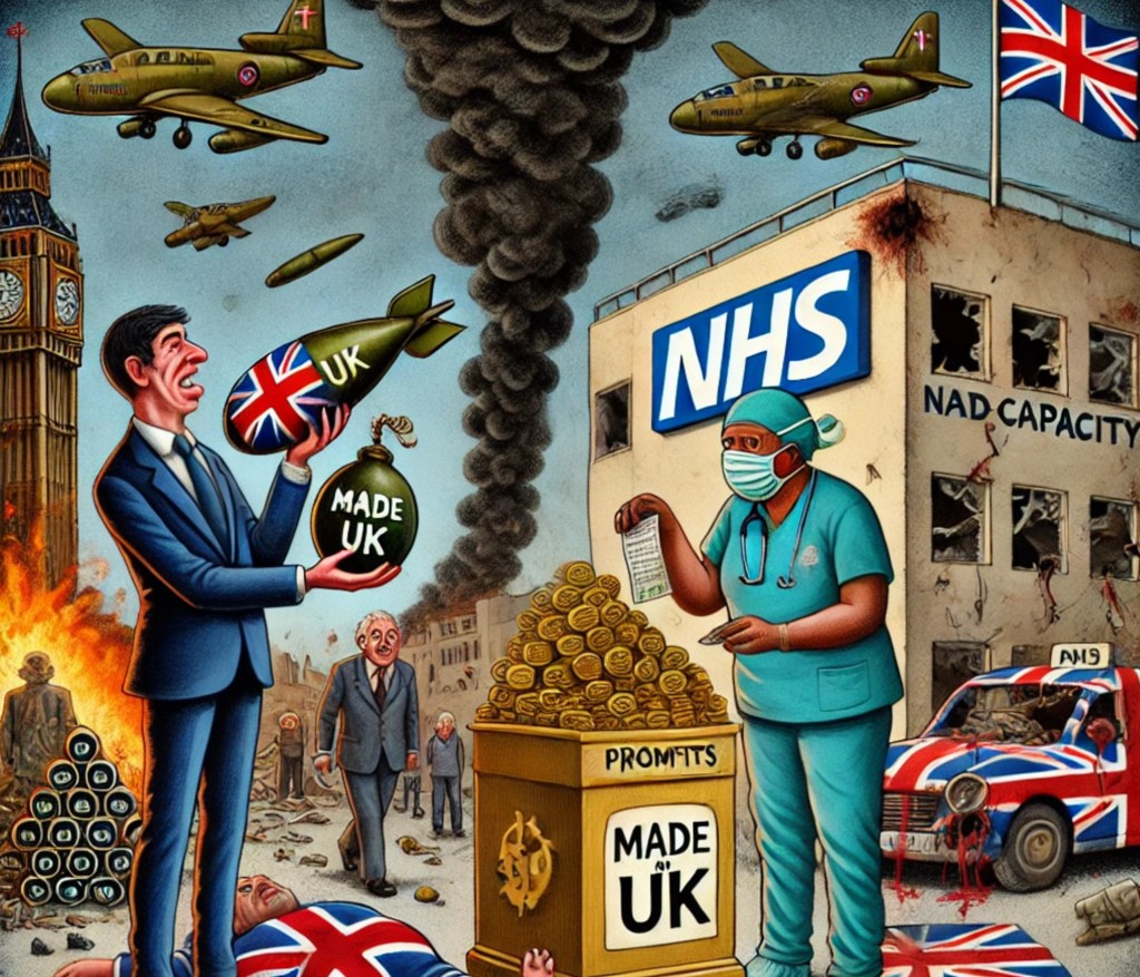 The Ministry of Defence cuts ribbons at arms fairs, while junior doctors cut shifts to survive. We export carnage, import photo ops, and call it “moral leadership.” Meanwhile, the NHS is being hollowed out like a piñata at a Tory donor party—overworked, underpaid, and asked to clean up a mess it didn’t make.