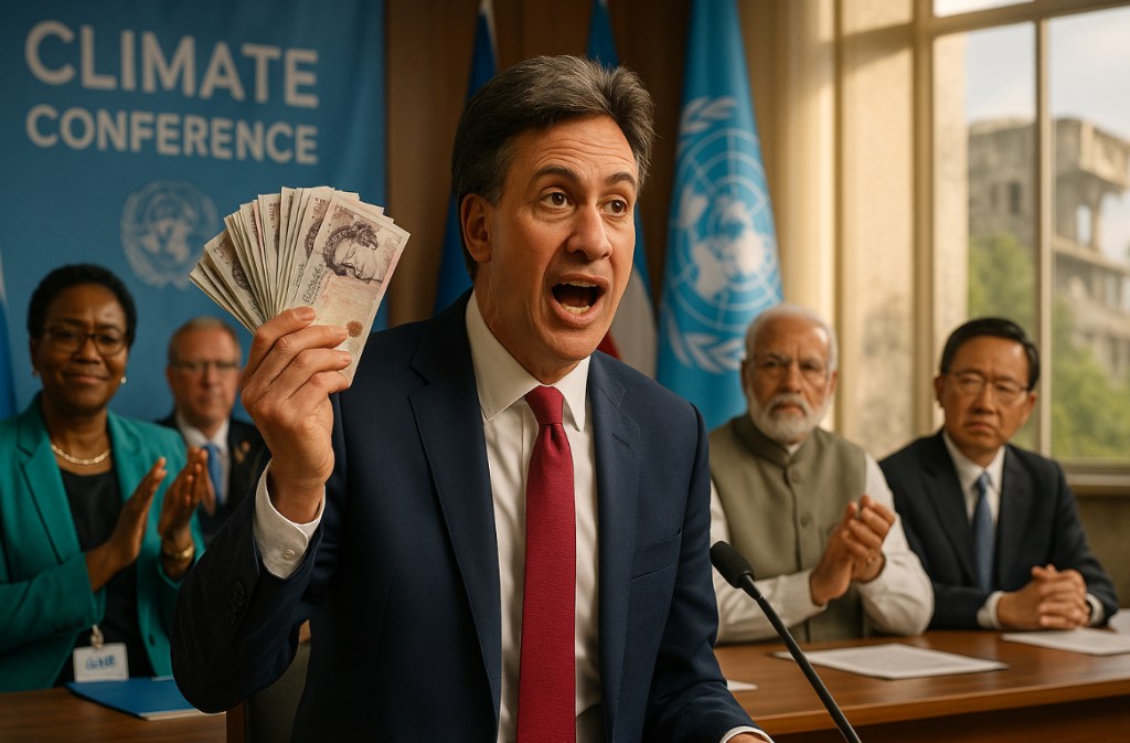 💸🌍At COP, Ed Miliband didn’t just speak about Britain’s role in tackling climate change—he decided to play the role of the world’s most generous dinner guest, pulling £11.6 billion out of his metaphorical wallet like it was loose change. Turns out, part of the missing £50 billion black hole haunting the Treasury wasn’t lost at all—it was stuffed neatly in Ed’s pocket, waiting for the perfect moment to be handed to the rest of the planet.