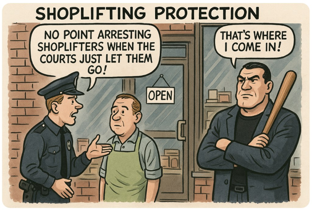 Let’s face it: when law enforcement throws up its hands, someone else will gladly pick up the stick—or, in this case, the baseball bat. The Mafia once offered “insurance” in New York, and it worked on a very simple principle: pay up, and they’ll stop your windows from mysteriously smashing every week. Now, with Britain’s justice system too busy sighing, shrugging, and sipping Earl Grey, how long until shopkeepers are forced to reinvent the Sopranos in Surrey?