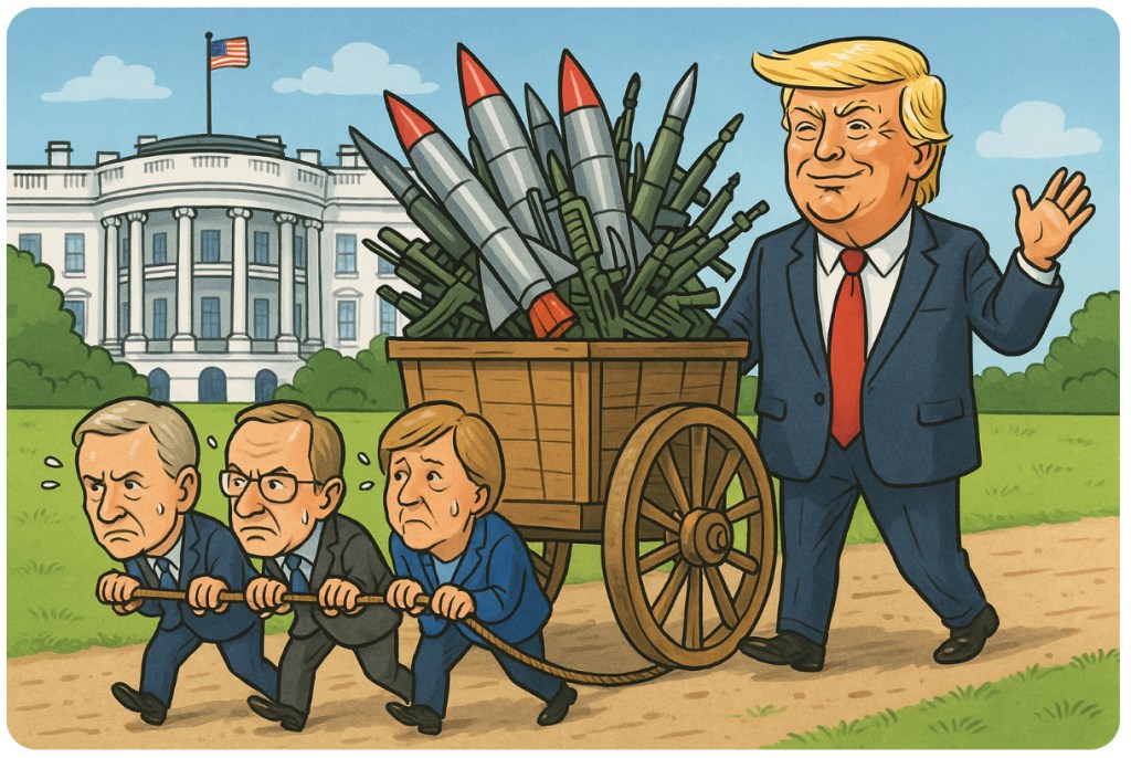 💣🕊️Peace talks with Trump are like going to rehab with a flask in your pocket: the intent sounds good, but the follow-through is weaponized. So when European leaders sat down for a “historic” moment of diplomacy with The Donald, they didn’t expect the finale to be a $90 billion weapons deal. But here we are—peace on paper, payloads in practice.