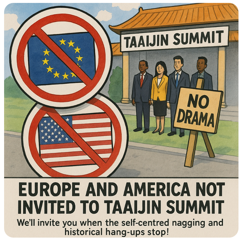 🌍🚷Forget red carpets and champagne receptions—the Taaijin Summit apparently runs on a “no drama, no delusion” entry policy. Which instantly disqualified both Europe and America. The organisers didn’t even bother with diplomatic jargon. They wanted clarity, calm, and collaboration… not colonial hangovers and culture wars.
