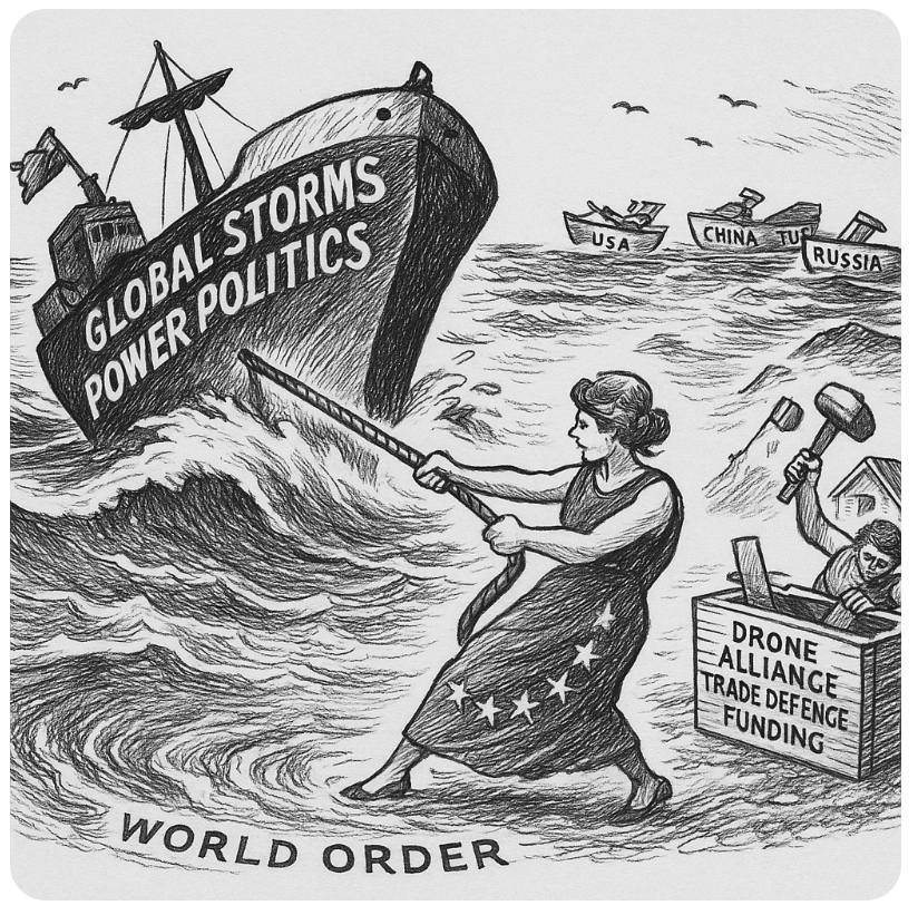 While the great ships of the US, China, and Russia sail off chasing their own interests, the EU is left clinging to the ropes of a sinking order — trying to steady “Global Storms” with one hand, while hammering together its own lifeboat of defence, trade, and funding with the other.