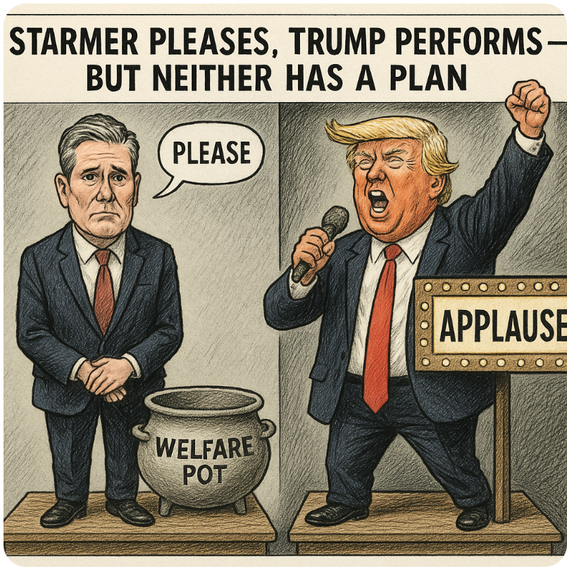 The irony? Trumpβs emptiness feels full, because itβs dressed in fury and fandom. Starmerβs emptiness feelsβ¦ well, empty. Because itβs wrapped in PowerPoint decks and managerial caution. One drains the room, the other electrifies it β even if both are selling snake oil.