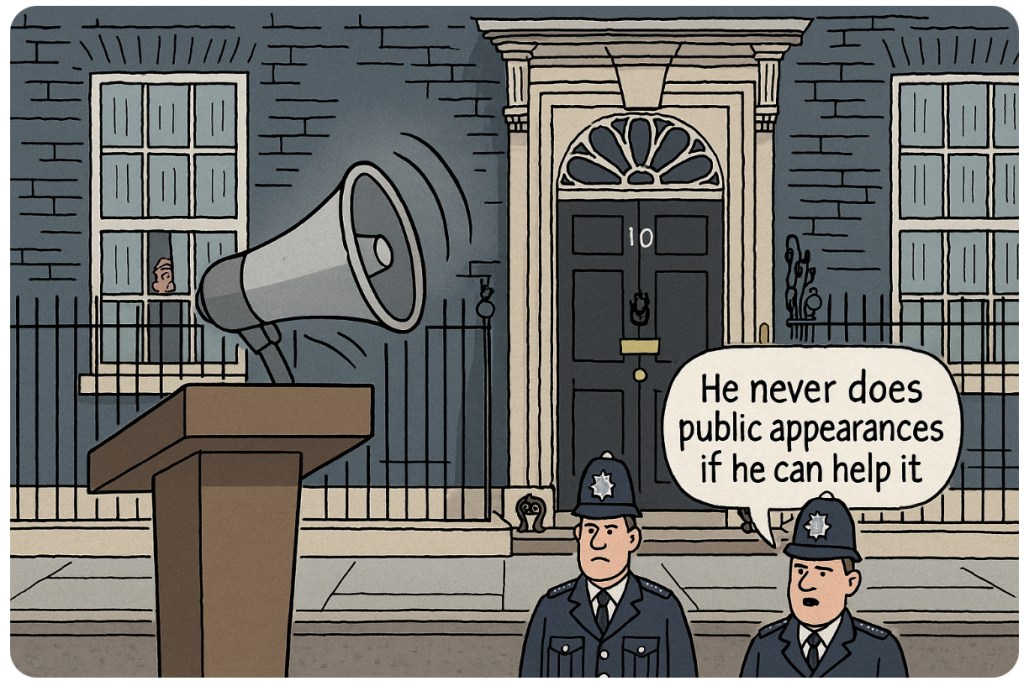 Starmer’s problem isn’t what he says—it’s where he says it. Always from a lectern, never from the street. Always rehearsed, never raw. He’s the political equivalent of a voicemail message: formal, monotone, and faintly apologetic. You won’t see him rolling up his sleeves in a rowdy crowd because that would require charisma, conviction, and—God forbid—risk. Instead, he hides in the oak-panelled bunker of Downing Street, wagging his finger through the press like a teacher marking essays.