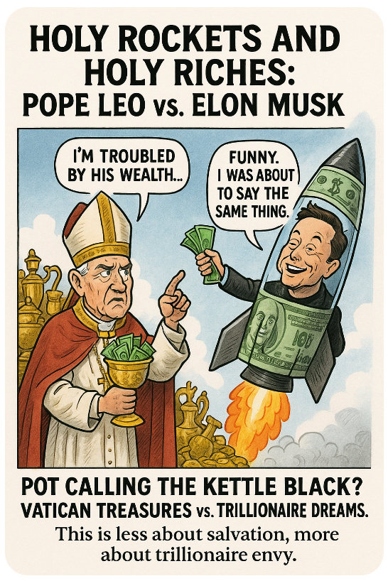 And here’s the awkward bit: isn’t this all just the pot calling the kettle black? The Vatican’s vaults could bankroll a few space programs of their own. Gold chalices, priceless art, prime Roman real estate—sounds like a rival billionaire’s portfolio. Maybe Leo’s less worried about Musk becoming a trillionaire and more peeved that he didn’t think of selling indulgences via PayPal first. A touch of holy jealousy, perhaps? ✝️💰