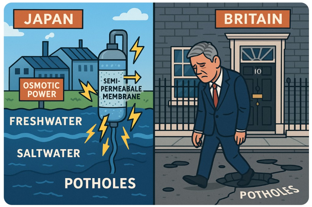 🌊⚡🕳️While Japan is out here launching the first osmotic power plant in Asia—literally bottling the sea and river into clean, constant electricity—Britain can’t even fill a hole in the road without it becoming a national saga. Japan is harnessing the difference between saltwater and freshwater to power homes, while the UK is still debating whether it’s morally acceptable to expense a duck house.