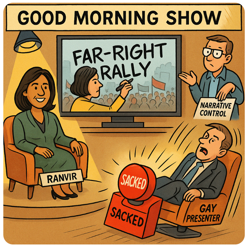 Welcome to the bizarre world of British breakfast TV, where logic gets filtered out faster than a dodgy coffee machine. Ranvir stays. The gay presenter goes. Labels are slapped on live television with all the care of a toddler finger-painting—“far-right rally” here, “controversial protest” there—whether or not reality bothers to match the script. And when challenged? It’s brushed off with the subtlety of a shrug.