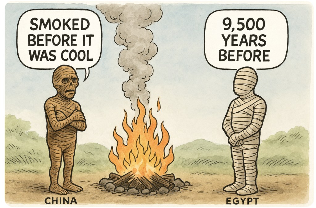 🧻🔥Turns out, the history books may need a little exfoliating—like 14,000 years’ worth. Scientists have dug up mummies in China that outdate Egypt’s by nearly ten millennia. And no, these weren’t wrapped in Tutankhamun’s finest linens; they appear to have been smoke-dried, like humanity’s first attempt at a jerky subscription service. Imagine logging into your ancestry app and finding out your great-great-great-grandparents were the original BBQ side dish.