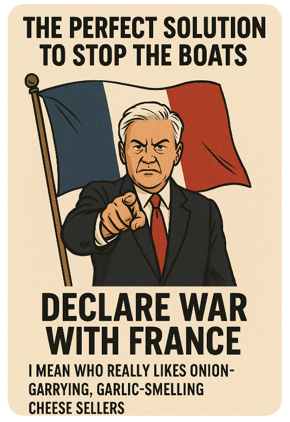 So there you have it: war declared, wine banned, cheese repurposed, lawyers conscripted, and the Channel transformed into a floating no-go theme park. Is it practical? Absolutely not. Is it funny, annoying, and guaranteed to get under someone’s skin? You bet.