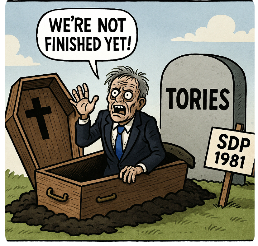 The Conservative Party has discovered a new political strategy: time travel by selective memory. Their logic? Back in 1981, the SDP soared in the polls, then belly-flopped at the ballot box with a measly 23 seats. Therefore, the Tories—currently clinging to relevance like a pub landlord at closing time—are immortal. If it didn’t kill them before, it won’t now. Genius! Because of course, Britain in 1981 and Britain in 2025 are basically the same. Inflation, housing crisis, Brexit hangover, climate catastrophe—yep, identical to Michael Foot mumbling about NATO. Totally the same vibe.