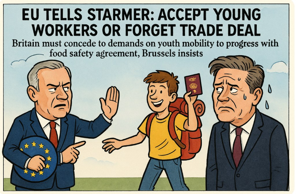 🇪🇺🧳🇬🇧So here we are again: Britain, once proud of its Brexit “freedom,” being told by Brussels that if we want to trade cheese without 14 layers of paperwork, we have to let Europe’s twenty-somethings waltz through our borders with backpacks and Wi-Fi passwords. Germany’s busy locking down its own frontiers to stop migrant flows, but the EU still insists Britain must open up for “youth mobility” if we want progress on food safety. Translation: You can’t sell us your sausages unless you also take our students.