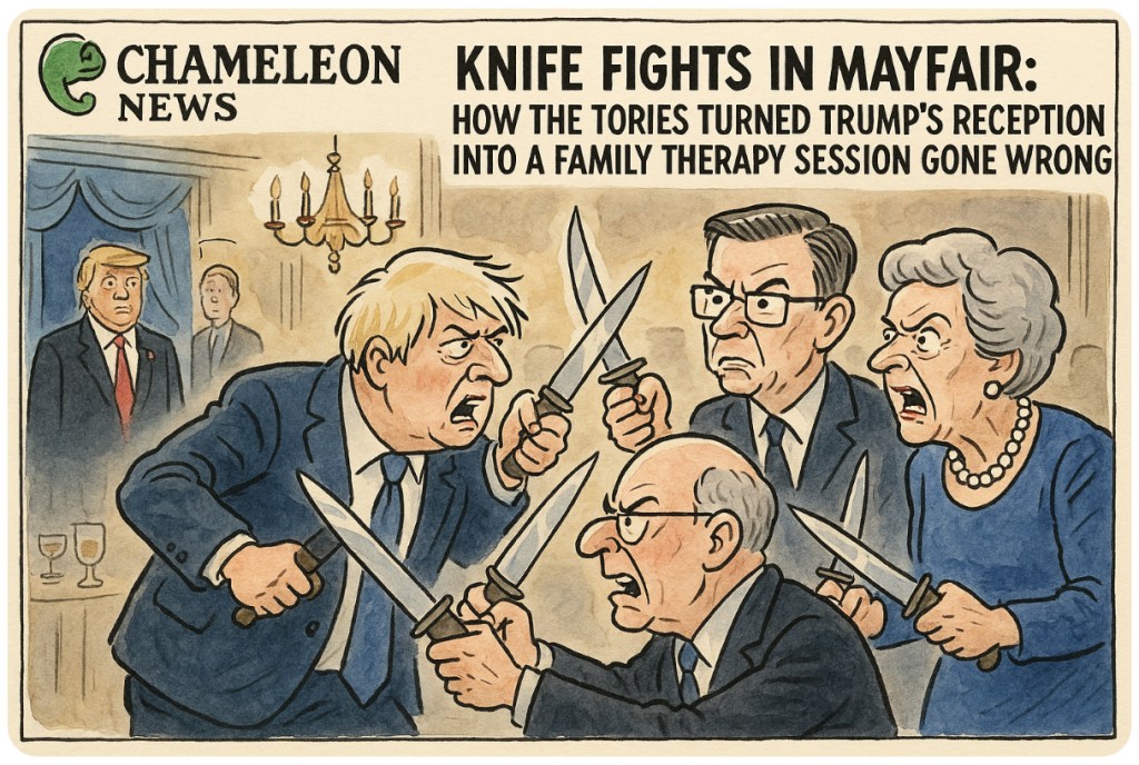 🔪🍸🇬🇧🇺🇸 Ah, the glamorous optics of statecraft: Donald Trump in London, the royals polishing the silver, Mayfair hosting the kind of reception meant to scream “unity” louder than a Nigel Farage pub rant. Instead, what did the Conservatives serve up? Not cocktails and camaraderie but a bare-knuckle brawl in pearls and pinstripes. Boris Johnson, ever the mischief-maker with a glass in hand, apparently decided to play Migrants’ Defence Counsel. Cue the grandees sharpening their forks over migration figures and Brexit promises. Unity photo-op? Try political self-immolation under chandeliers.