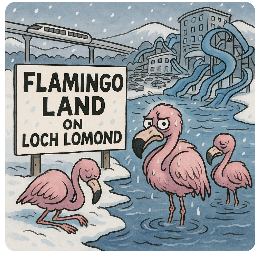 🦩❄️Ah yes, just what the serene, mist-draped waters of Loch Lomond have always been missing: a monorail, a water park, and a battalion of confused flamingos wondering why their feathers are frozen solid. Lomond Banks and Flamingo Land want to plonk 100+ lodges, two hotels, and more parking than the M8 can handle right on Scotland’s most treasured loch. Because when you think ancient landscapes and national heritage, obviously the next step is rollercoasters and slush puppies.