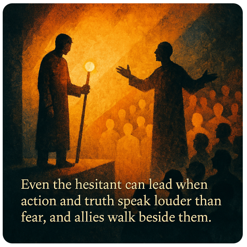 Even the hesitant can lead when action and truth speak louder than fear, and allies walk beside them.