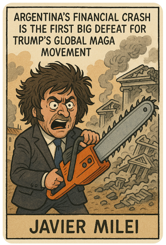 Argentina’s financial implosion has turned into the first major car crash for Trump’s global MAGA cosplay. Javier Milei, the self-styled “anarcho-capitalist” with a chainsaw prop straight out of a Halloween sale, promised to slash the state into submission. Instead, he’s given Argentina a sequel to the same South American soap opera we’ve seen for decades: wild promises, economic freefall, and leaders who confuse shock value with policy.