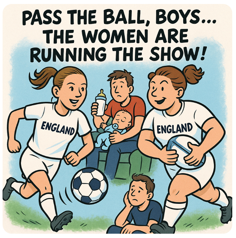 The English men’s footballers and rugby lads might want to swap their boots for baby bottles, because let’s face it—while they’re fumbling tournaments and nursing excuses, the women are busy winning. From the Lionesses lifting trophies to the Red Roses bulldozing through scrums like a wrecking ball in eyeliner, the message is clear: lads, the babysitting rota’s on the fridge.