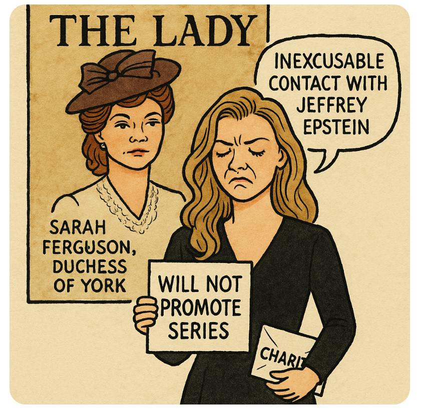 Imagine being cast as the lead in a lavish period drama, only to find the actual subject of your show has Epstein’s number on speed dial. Dormer clearly decided she’d rather star in “The Actress With a Conscience” than play PR cover for Fergie’s bad judgment.