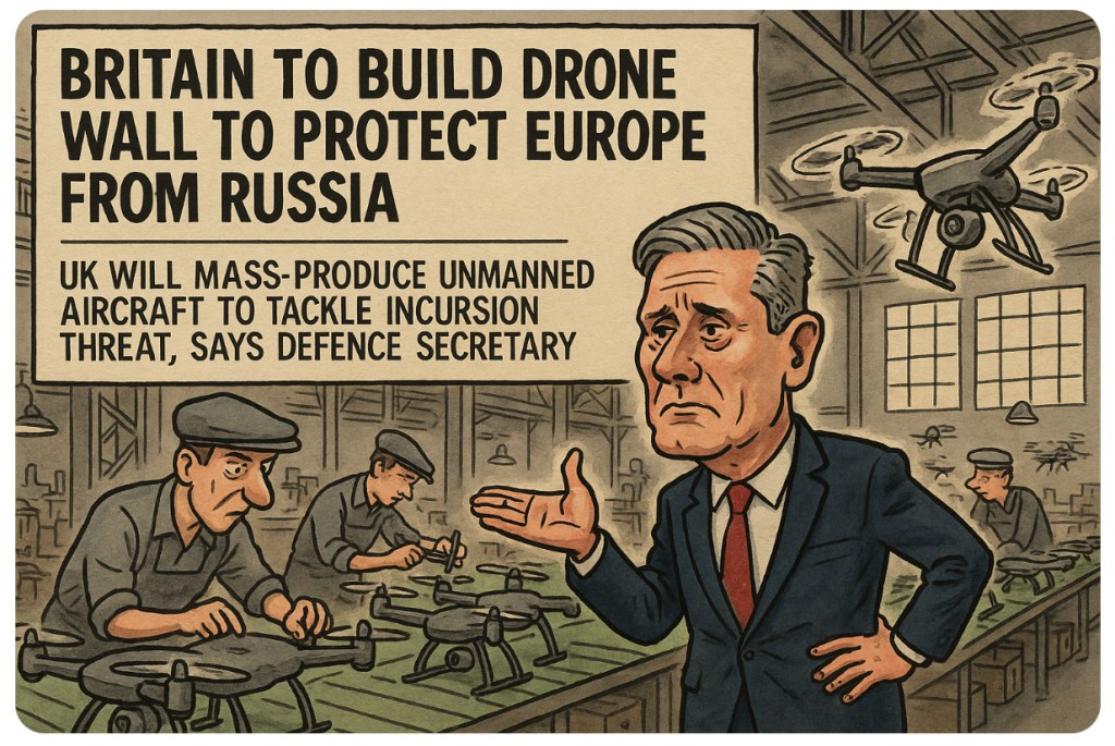 Once upon a time, Britain built ships, trains, cars, steel, textiles—you name it. Now? We’re apparently pivoting to mass-producing drones, because nothing screams “industrial renaissance” quite like a fleet of buzzing death robots to guard Europe from Russia. Defence Secretary says it’s about security; Labour spin doctors say it’s about innovation; the rest of us suspect it’s just the only growth industry left after decades of deindustrialisation.