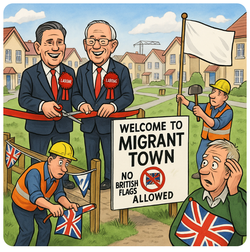 Let’s be clear: Britain does need homes, but selling it as “new towns for migrants” while telling the locals to keep their flags in the drawer feels less like policy and more like satire written by Armando Iannucci. Except it’s real. And you’re paying for it.