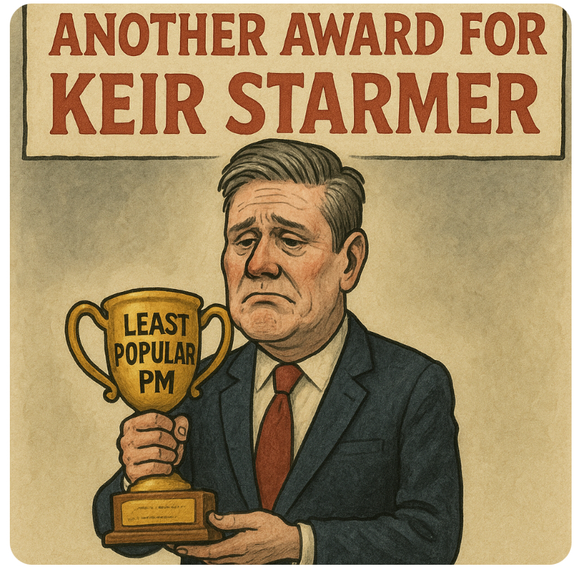 Starmer has finally found his superpower: being less liked than a wasp in a beer garden. Think about it—people have lived through the three-day week, Thatcher’s poll tax, Blair’s Iraq war, Cameron’s Brexit gamble, and Liz Truss’s 49-day kamikaze economics… and still, nobody’s ever flopped harder in office than Sir Keir.