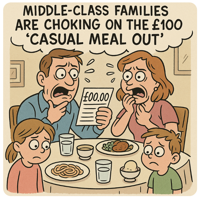 Once a humble Saturday night ritual, dining out has become a full-blown financial emergency. Middle-class families are now facing “bill shock” as a casual meal for four casually strolls past the £100 mark—without drinks, desserts, or dignity. Welcome to Britain 2025, where eating out is now classified as a high-risk economic decision, somewhere between buying a house and sponsoring a Premier League team.