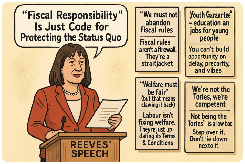 🪙📉Labour’s economic pitch under Rachel Reeves is a manifesto of managed decline dressed in spreadsheet respectability. Behind every cautious phrase lies the sound of bold ideas being quietly strangled with a red silk tie. If you were hoping for an economic reset, what you’re getting is more like a reboot of “Osborne Lite” — with slightly better hair.