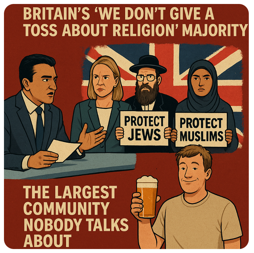🍻🙄Adil Ray grilled the Home Secretary about protecting Jewish and Muslim communities — fair, urgent questions. Then we’ve got the far-right, who want riot shields just for showing up in Stone Island. But there’s another group never mentioned on Good Morning Britain: the “normal” white, secular Brit who doesn’t give a single soggy biscuit about religion. You know them — the people who think “faith wars” are just something that interrupts EastEnders or delays the last train home.