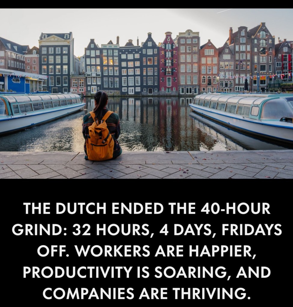 Let’s face it — the Dutch figured out what the rest of us have been pretending not to notice: more hours ≠ more output. They’ve replaced endless “busy” with efficient “balanced.” Fridays now belong to family, friends, and flat white-fueled canal walks, not spreadsheets and stress headaches. ☕🚲