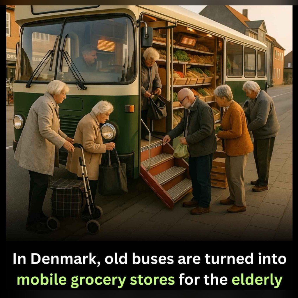 🚌🥕While most countries debate “innovation,” Denmark quietly turns nostalgia on wheels into salvation on wheels. Behold the humble old bus — reborn as a mobile grocery store cruising through small towns and senior neighborhoods. No delivery apps, no gimmicks, no AI telling Grandma she’s out of oat milk — just warm heaters, friendly drivers, and shelves lined with local produce.