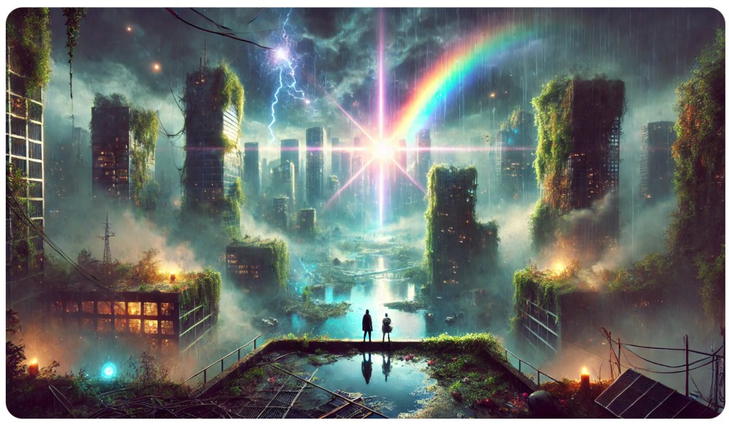 One day, as Nara repaired a weather drone on the roof of an old hospital, the machine’s cracked lens caught the light. The reflection bent across the dark clouds above, scattering into color. A band of glassy hues stretched across the entire sky—a fragment of a world that had nearly forgotten beauty.