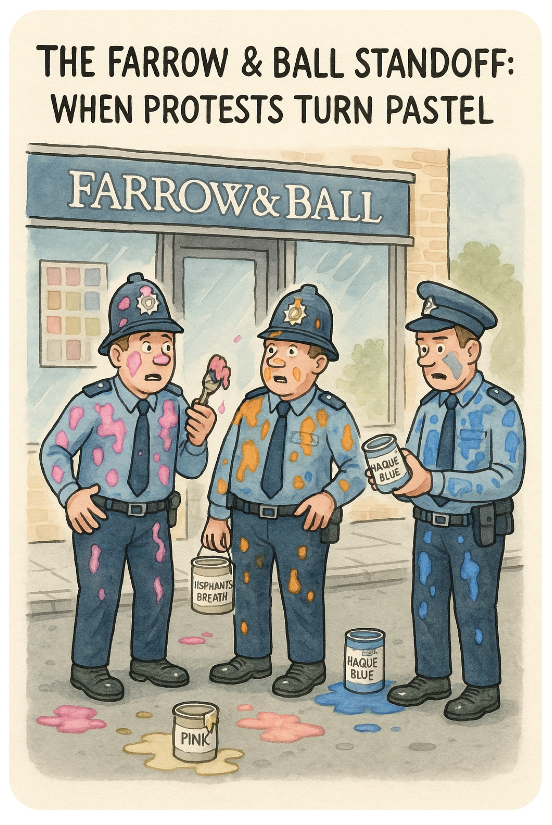 🎨🚓It started as a paint protest and ended as a full-blown performance piece titled “Britain, But Make It Eggshell.” Police in Brighton found themselves dodging tins of Farrow & Ball’s finest — pelted with premium paint in what can only be described as the most middle-class melee ever recorded.