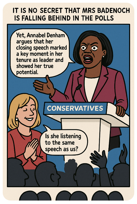 Was Annabel Denham hearing inspiration — or just the echo of party spin bouncing off the conference walls? Did Kemi’s “big moment” really land, or did it fall flat faster than a ministerial U-turn? Drop your take below — satire welcome, delusion optional. 💬🔥