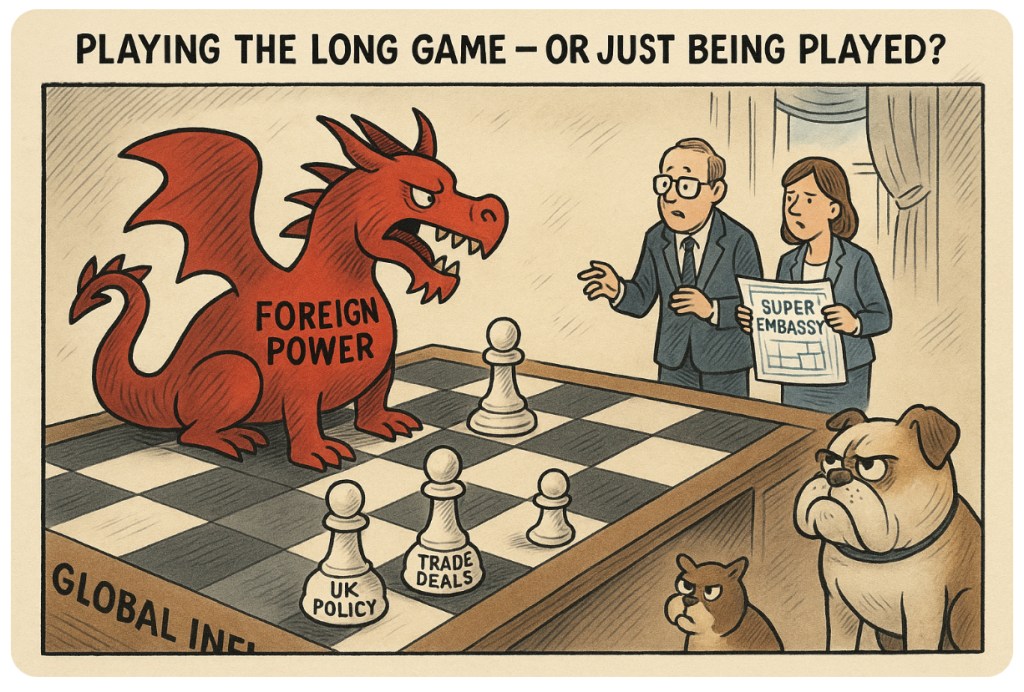 🏛️🐉Ah, the grand tradition of British diplomacy — where “standing firm” now apparently means bowing deeply while whispering, “Please don’t be cross, President Xi.” The latest scandal swirling around Sir Keir Starmer’s Labour? A Chagos deal and a “super embassy” so lavish it might as well come with complimentary surveillance drones.