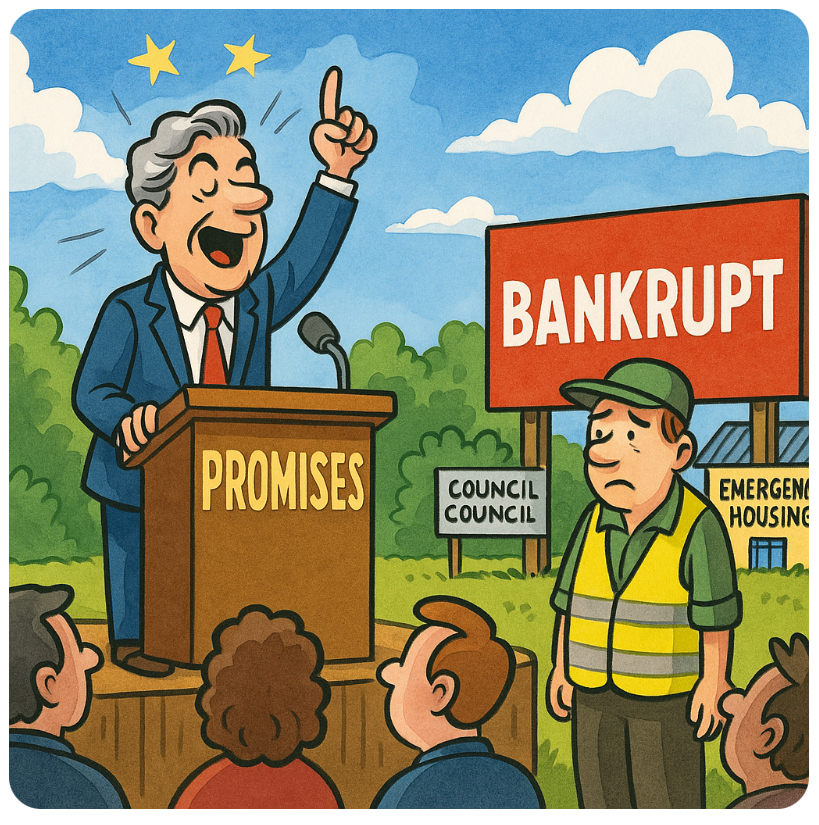 Now, emergency housing costs are spiralling — £2 million in 2025 alone — and local services are being gutted faster than a fiscal audit.