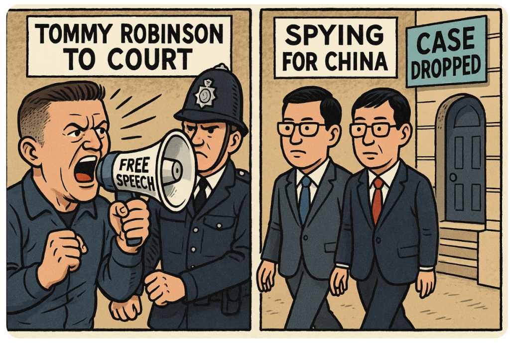 🎭🕵️♂️In a plot twist that would make even Netflix go, “nah, too unrealistic,” the UK government seems better equipped to drag Tommy Robinson into a courtroom than to properly prosecute people allegedly caught playing footsie with the Chinese state. Yes, while the courts were warmed up and ready for Robinson’s latest courtroom cameo, it turns out that cases involving alleged espionage—the kind that actually threatens national security—are quietly being folded like a deck chair in a Downing Street garden party.