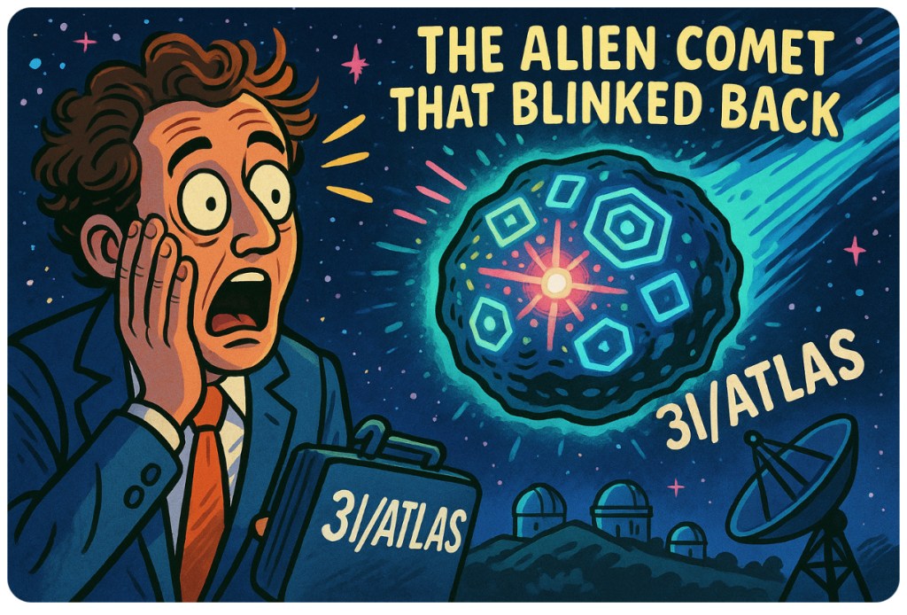 🛸✨Move over, ‘Oumuamua — there’s a new cosmic celebrity streaking through the headlines, and this one might just be waving hello. Astronomers across the globe are losing sleep (and probably sanity) over 3I/ATLAS, the interstellar oddball now behaving like it got bored of physics and decided to freestyle. It’s pulsing light like Morse code, zigzagging like a drunk satellite, and shimmering with eerie, geometric patterns that look more engineered than accidental. Somewhere, a NASA intern just whispered, “It’s alive,” and the internet hasn’t stopped screaming since.