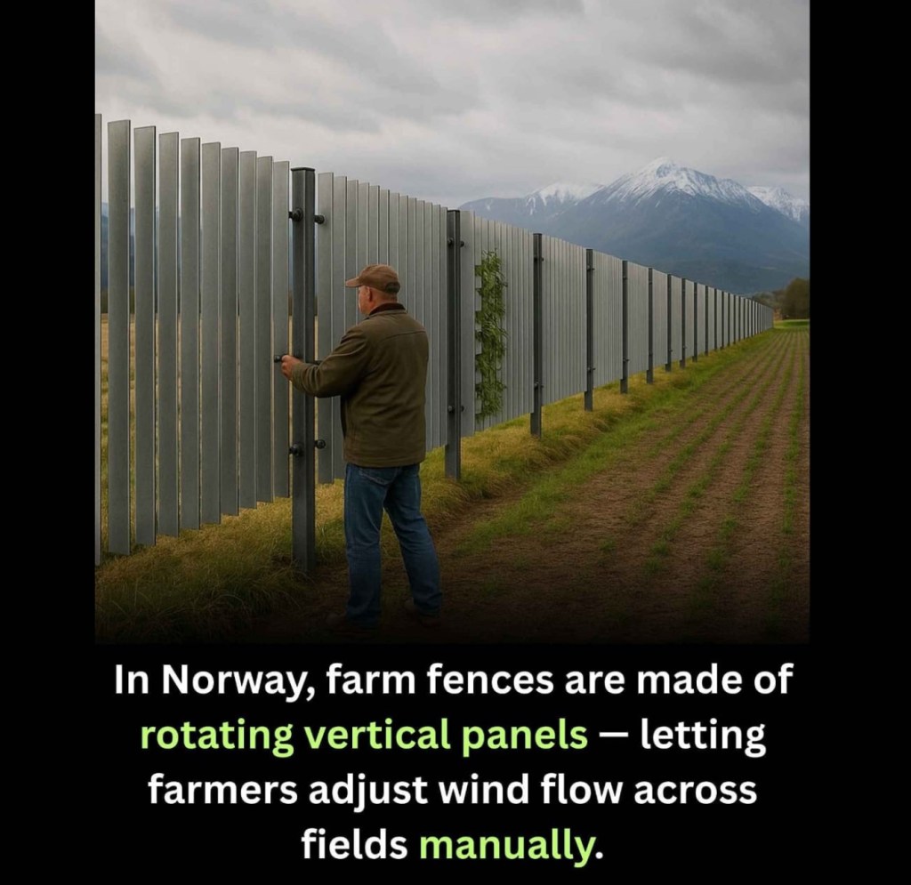 🌾💨Norway has done it again — turning something as humble as a fence into a climate-controlling masterpiece. Forget static wooden posts or wire grids. Norwegian farmers are now using rotating vertical panels that can literally breathe with the wind. By twisting these sleek slats, they can decide whether to block gusts, funnel breezes, or fine-tune airflow like Mother Nature with a remote control.