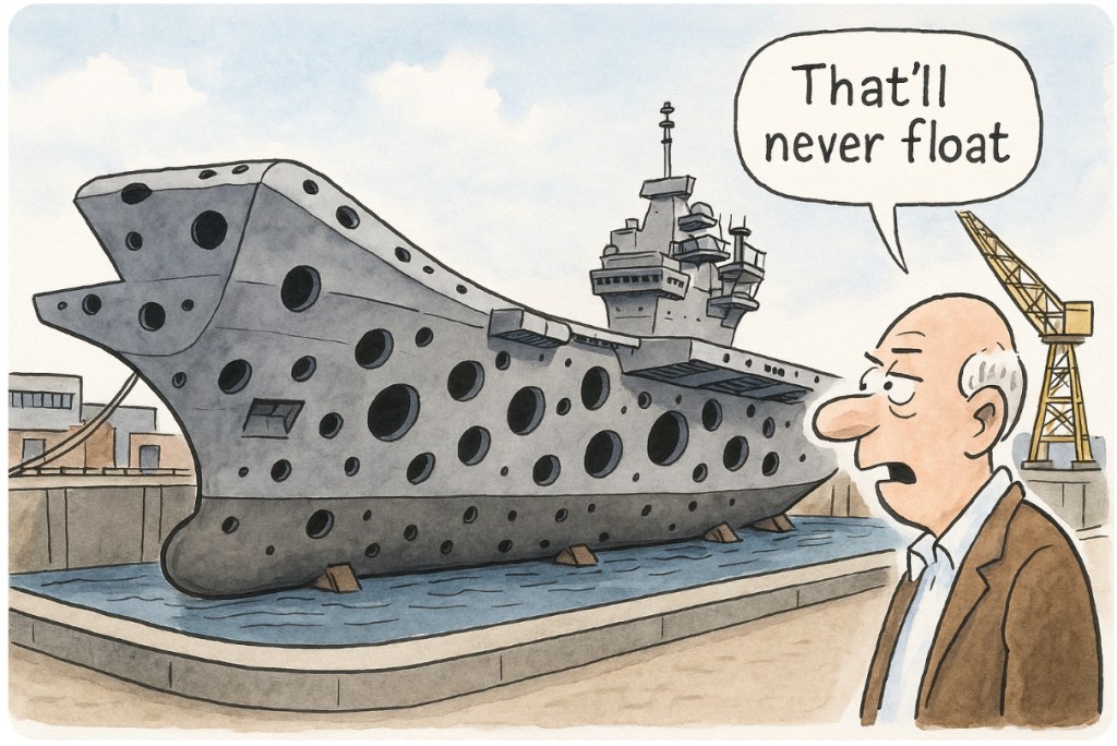 Every year, the MoD somehow spends more on less. We’re buying tanks that can’t tank, planes that can’t fly, and ships that float mostly on excuses. The potholes on Britain’s roads are multiplying faster than defence contracts, and if you squint hard enough, they do look like mini black holes — perhaps portals directly connected to the Treasury.