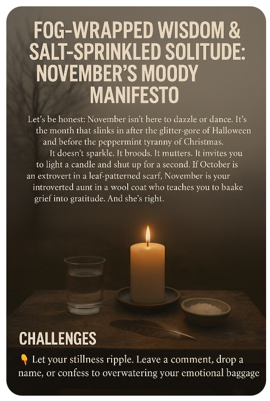 🌫️🕯️Let’s be honest: November isn’t here to dazzle or dance. It’s the month that slinks in after the glitter-gore of Halloween and before the peppermint tyranny of Christmas. It doesn’t sparkle. It broods. It mutters. It invites you to light a candle and shut up for a second. If October is an extrovert in a leaf-patterned scarf, November is your introverted aunt in a wool coat who teaches you to bake grief into gratitude. And she’s right.