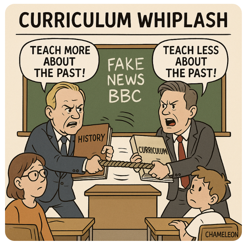 📚🌀Welcome to the United Kingdom’s premier game show: Who Wants to Rewrite the Curriculum? 🎤 Every time a new government gets the keys to the country, they seem to treat the national curriculum like a Spotify playlist—delete the last one, add some nostalgic throwbacks, and throw in a dash of political messaging. This week’s remix? Labour’s turn to “correct” what the Tories “restored,” while somehow dragging the BBC into a classroom lesson on fake news. Because nothing screams “balanced education” like teaching kids which state broadcaster is lying to them—during history class.