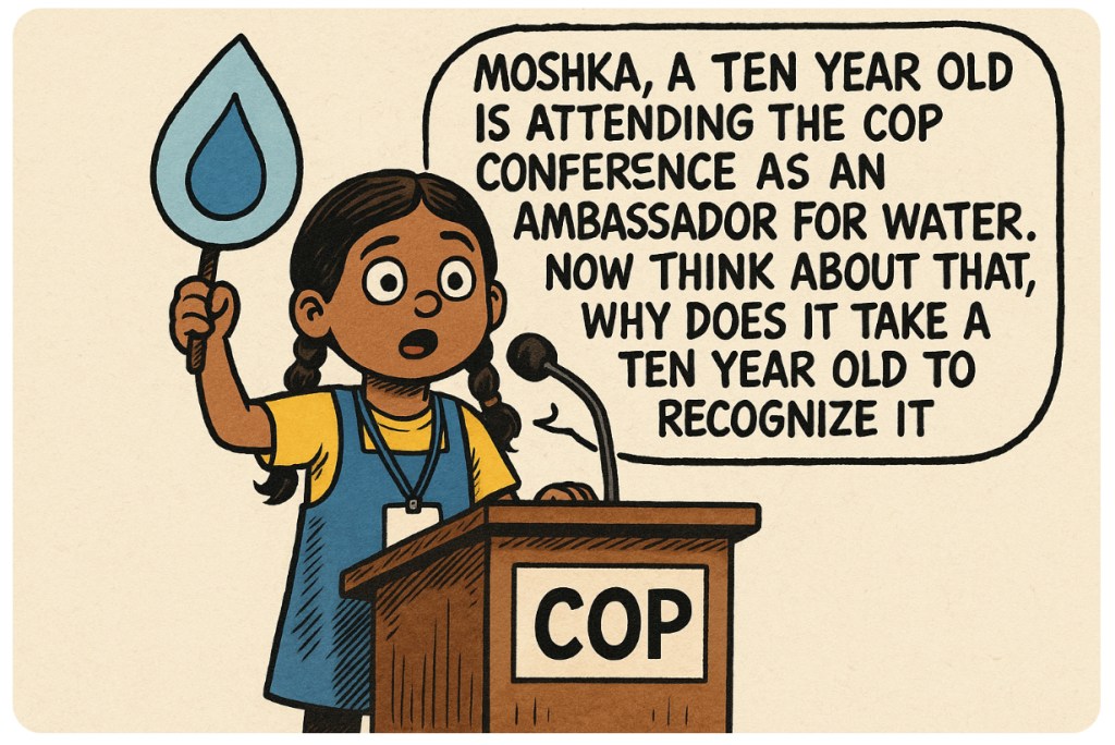 💧👧🏽🌍Meet Moshka. She’s ten. She still needs permission to cross the street but somehow has more sense than a room full of grey-suited delegates with climate policies older than her parents. This year, she’s at COPP as an ambassador for water. Because apparently, adults needed a child to explain that dying of thirst is… kind of a bad look for humanity.
