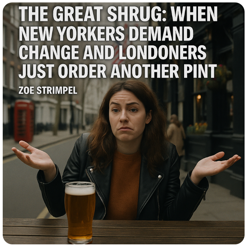 New Yorkers have a different rhythm — fast-talking, fast-acting, and unwilling to accept stagnation as destiny. When they see injustice, they tweet, march, campaign, vote. When Londoners see injustice, they raise an eyebrow and say, “Classic.”