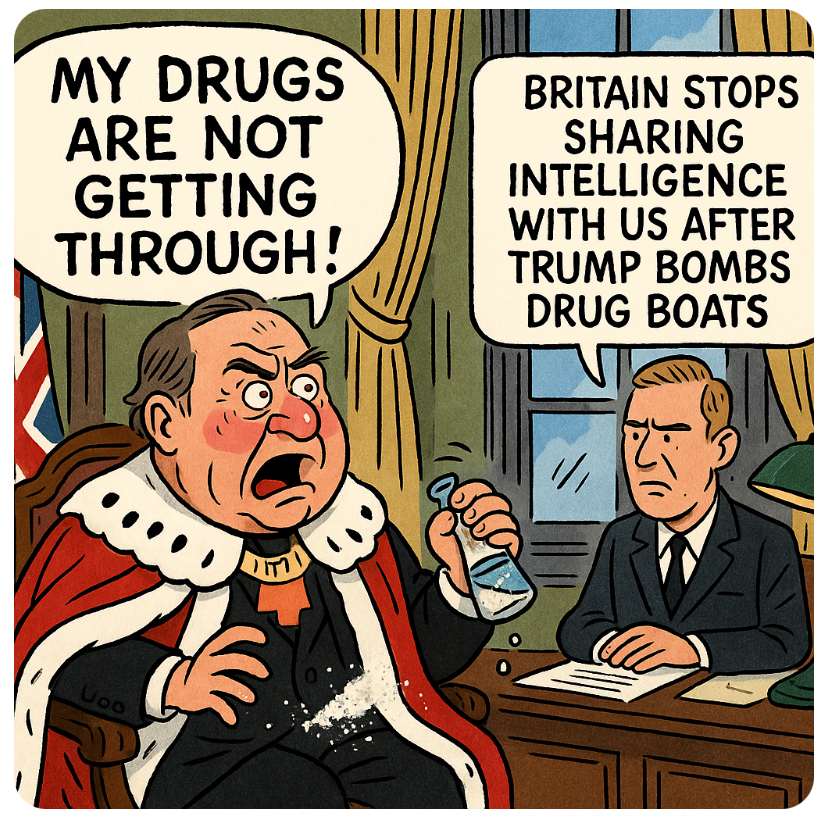 Β π₯π‘In a truly special relationship moment, Britain has slammed the brakes on sharing intelligence with the United Statesβafter Donald Trump, in peak Florida Man energy, started bombing suspected drug boats like a toddler playing Battleship with real missiles. And somewhere in the House of Lords, a certain Lord Hermer is reportedly not amusedβbecause apparently the supply chain for his favourite βpowdered importsβ just went up in smoke. π£ππ¬π§